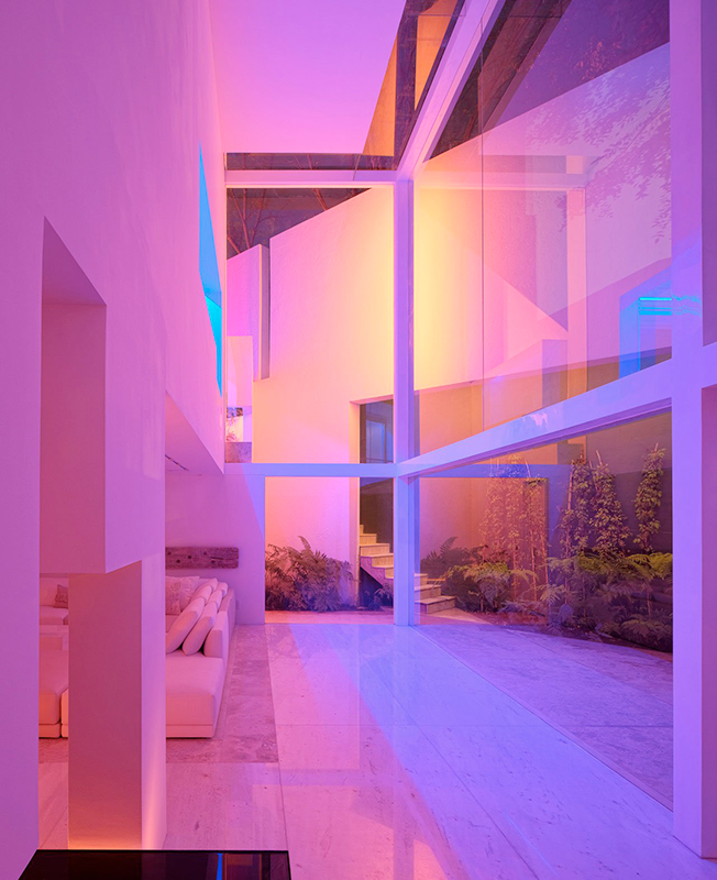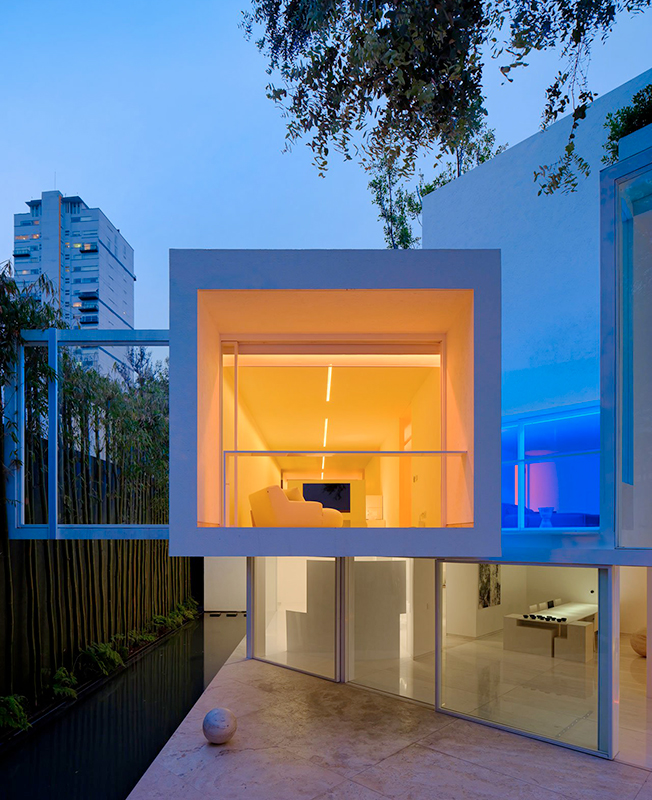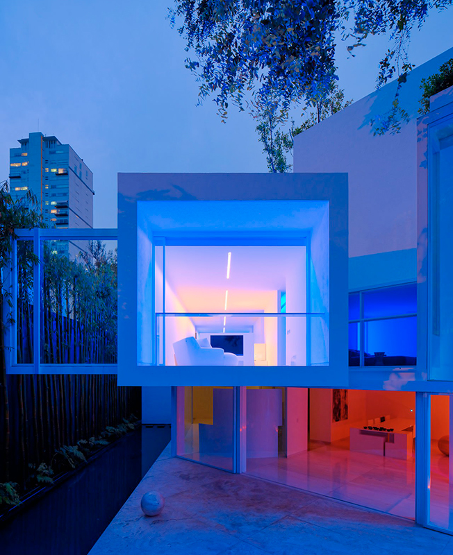 Архитектор Мигель Анхель Арагонес спроектировал минималистичную резиденцию в Мехико. Белоснежная днем, ночью она расцветает неоновыми огнями.