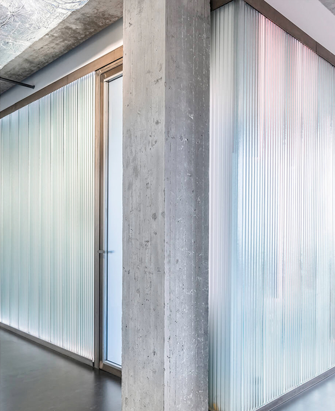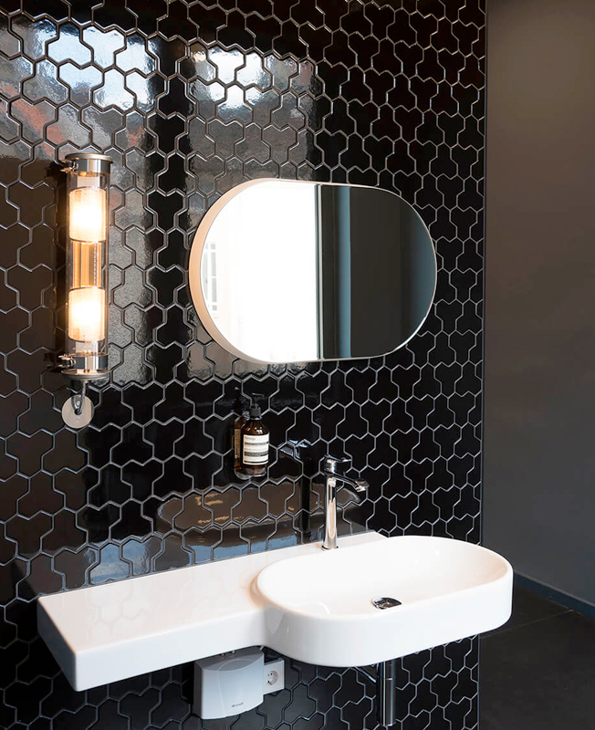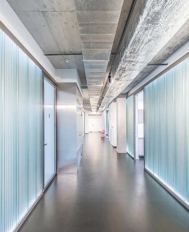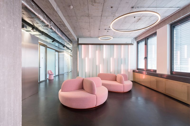 Вместо них — приятная глазу палитра и выразительные фактуры: стойка ресепшн и столешницы из терраццо, рифленые перегородки и цветные зеркала, светильники-обручи и экологичная мебель, сделанная на заказ. Рафинированные детали уравновесили грубыми бетонными поверхностями и видимыми элементами конструкции. Все это — визуальные отвлекающие факторы для пациентов, призванные помочь им расслабиться.