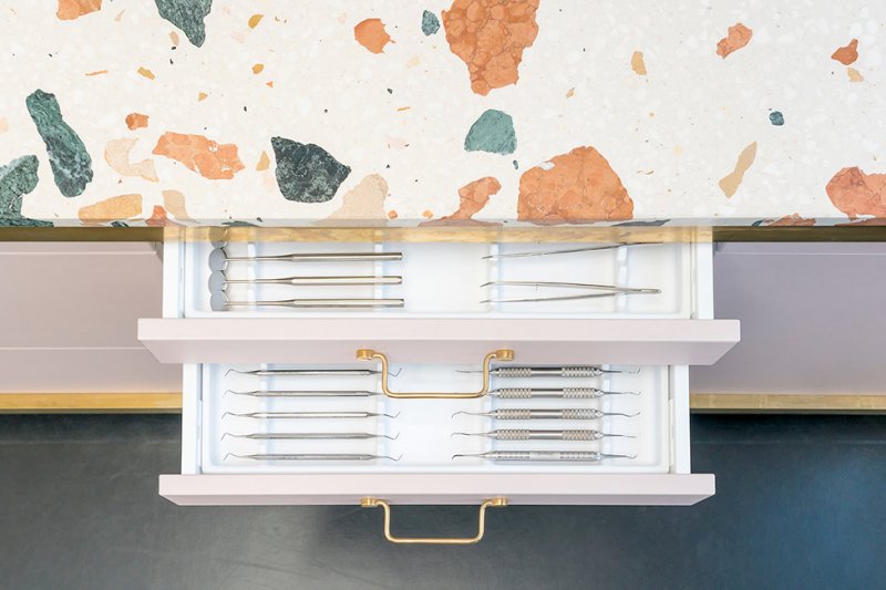 Розовый, латунь, терраццо... решения, уже привычные для жилых интерьеров, бутиков и кафе, Томас Карстен и Александра Эрхард, Studio Karhard, использовали при работе над стоматологической клиникой.