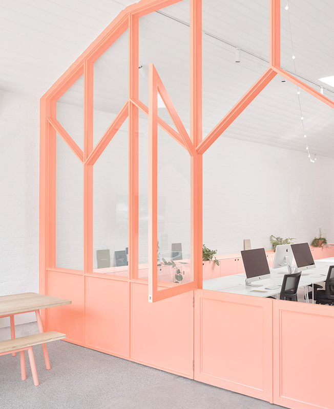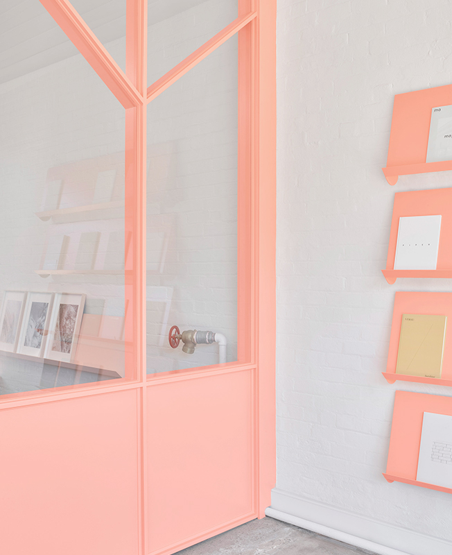 Основую ставку сделали на палитру. Кирпичные стены и деревянный потолок перекрасили в белый цвет, который делает пространство светлее и служит гармоничным фоном для деталей персиково-розового цвета. «Используются три оттенка персикового, каждый из которых определяет одну из трех частей студии — зону у входа, рабочую зону и пространство в глубине офиса», — говорят архитекторы.
