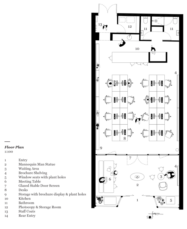 Заказчики — девелоперская компания Angle и брендинговое агентство Earl St, которые делят пространство, — хотели оживить свой темный и мрачный офис. Архитекторы начали с того, что выделили две зоны — ближе ко входу расположили приемную для встречи гостей и переговоров, а в глубине — места для сотрудников. Два пространства разделяет деревянная, частично застекленная перегородка. Нижняя ее часть непрозрачная, чтобы скрыть беспорядок, который возникает под столами сотрудников, и придать офису аккуратный вид с улицы.
