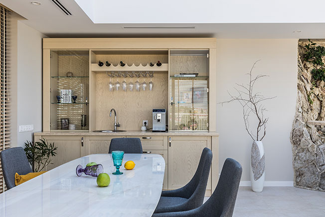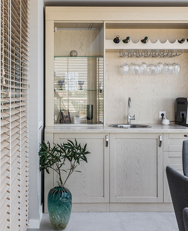 «Продолжением павильона стал деревянный настил в открытой части. Здесь организована зона барбекю и отдыха с плетеной мебелью, мягкими лежаками и оборудован открытый душ. Пространство террасы стало центром всего пентхауса — здесь собирается вся семья и проводит больше всего времени, любуясь морем и впечатляющими закатами».