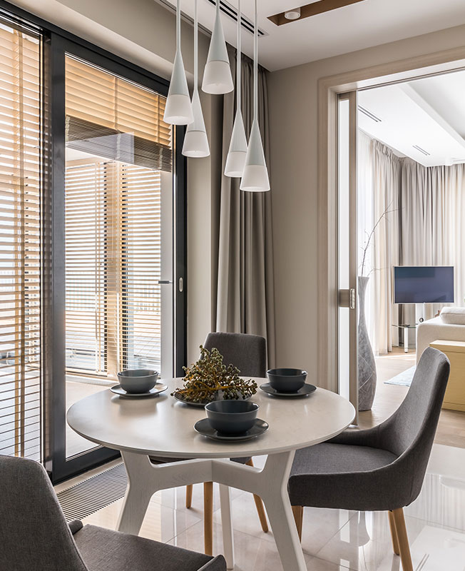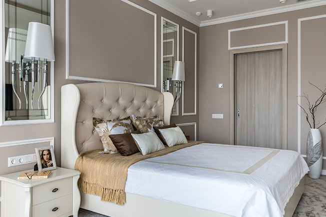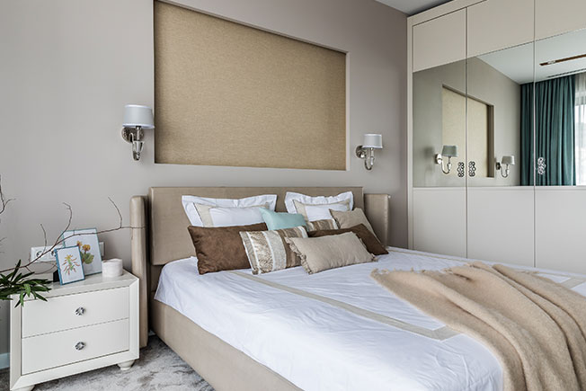 В результате были сформированы зона кухни и гостиной, разграниченные раздвижными перегородками, две спальни с санузлами, просторная прихожая. Единственным пожеланием родителей стала спальня с элементами легкой классики, которая гармонично вписалась бы в современный образ интерьера. Решить вопрос удалось благодаря спокойным песочным оттенкам и не громоздкой мебели по эскизам архитектора.