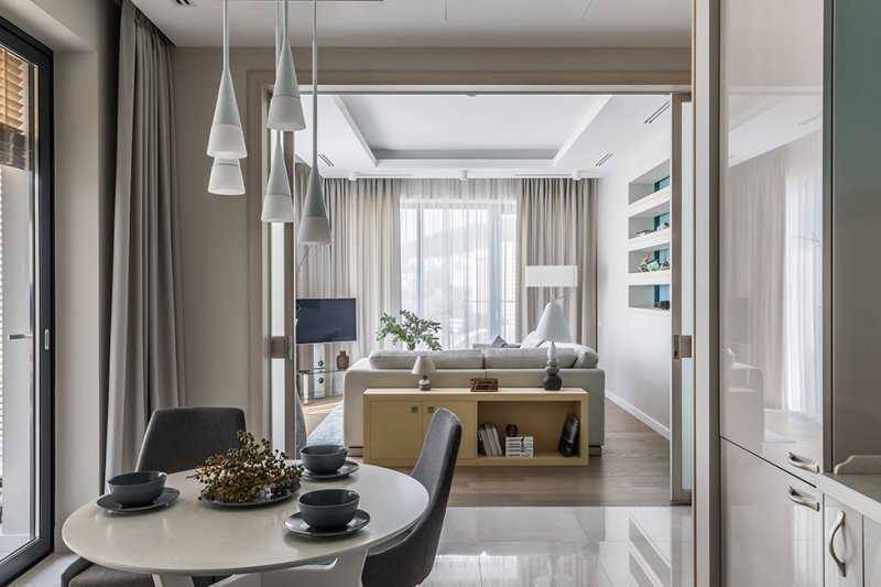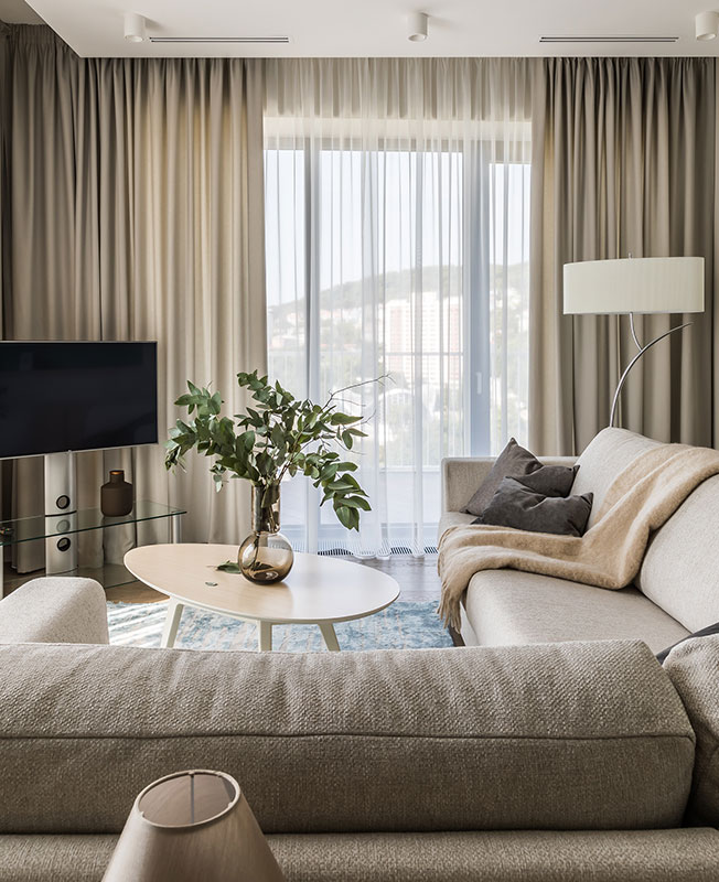 «Несмотря на разницу поколений, мы быстро пришли к пониманию стилистики и цветовой гаммы: современный интерьер с простыми линиями, функциональной встроенной мебелью. В отделке отдавали предпочтение экологичным качественным материалам. Цветовое решение основано на теплых песочных оттенках с бирюзовыми акцентами — как раз в духе Сочи».