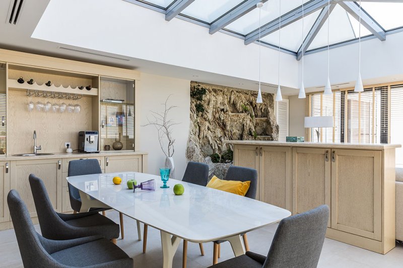 Главной задачей было грамотно и функционально распорядиться площадью огромной террасы. Пространство разделили на закрытую и открытую зону. Часть решили перестроить в павильон со стеклянной крышей и раздвижной фасадной конструкцией из теплого профиля, который превращал бы помещение в открытую беседку.