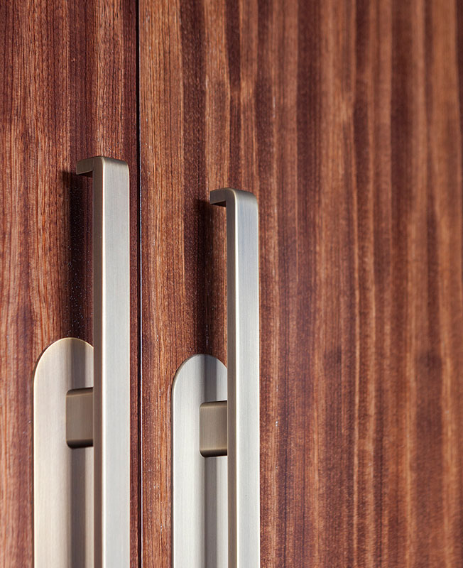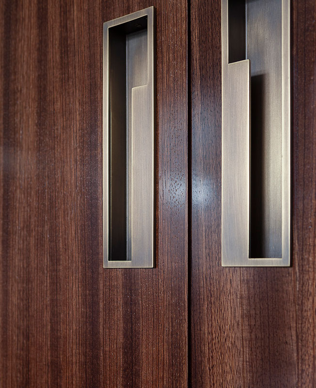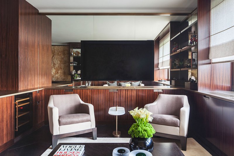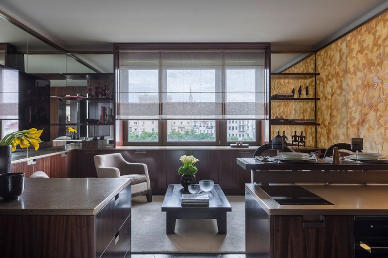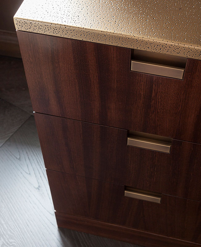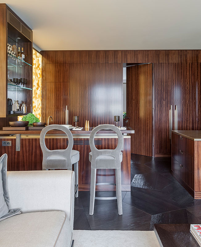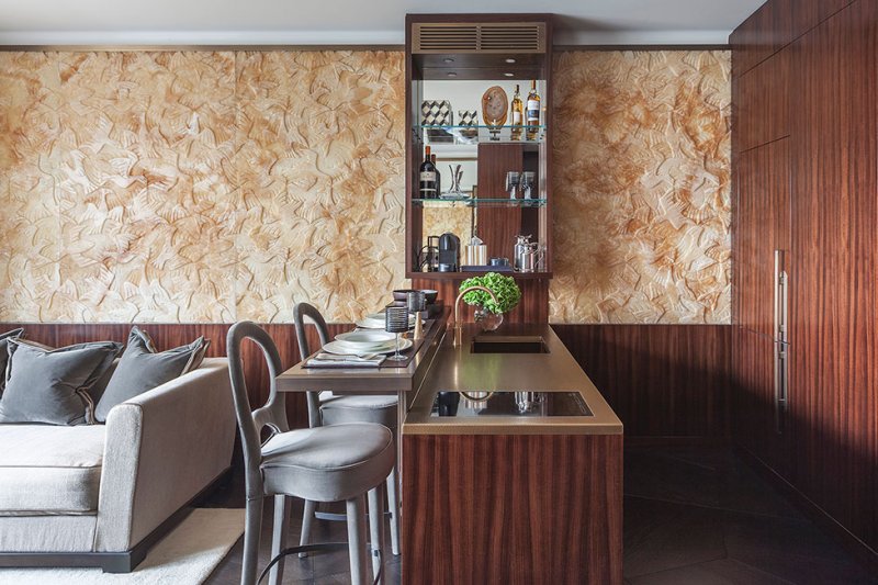 Для будущего интерьера выбрали золотисто-медовую палитру. Оникс и латунь, древесина палисандра с теплым красным оттенком и выразительным рисунком гармонично вписались в общую концепцию сдержанного интерьера.
