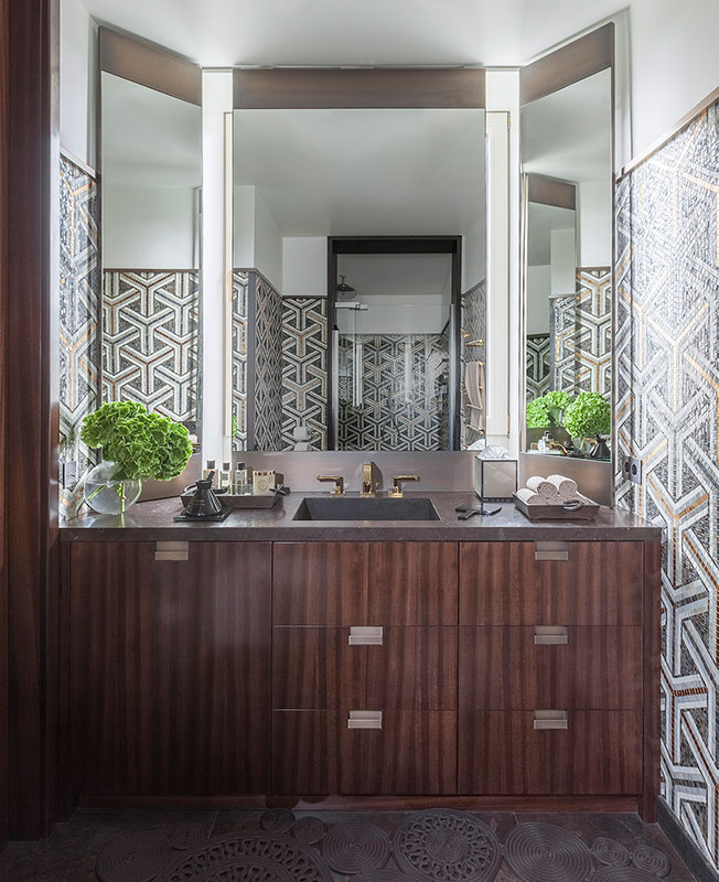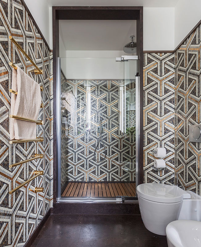 Для жилой зоны мы выбрали дубовую паркетную доску оригинальной шестиугольной формы от итальянской фабрики Castiglioni. Геометрический мотив повторяется и в ванной комнате. Для отделки применили мозаику. Нам хотелось создать нечто буржуазное, но без излишеств. Также мы решили сохранить окно в ванной и оставить доступ естественного света.