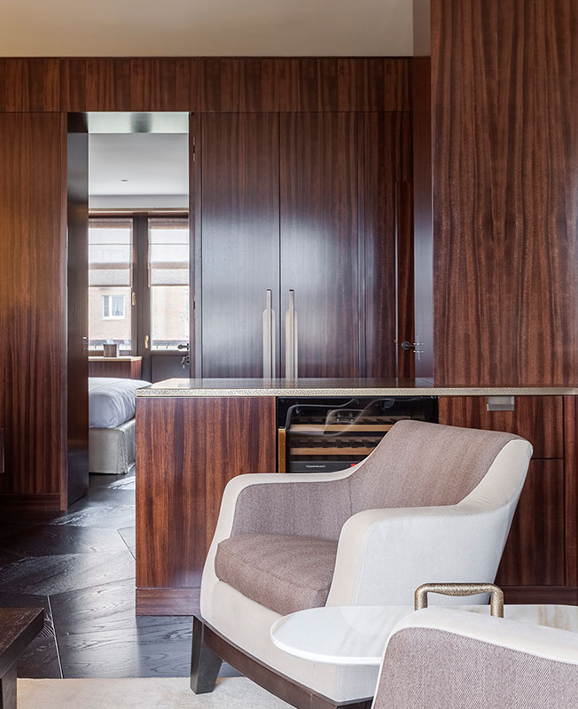 В этом проекте очень много столярных изделий из Италии. Когда материалы поставили в Россию и разгрузили их на объекте для последующего монтажа, свободного пространства остался ровно один квадратный метр. Каждый день в течение трех недель, рабочим приходилось выносить из квартиры часть материалов и распределять их по лестничным площадкам соседних этажей. Вечером дерево заносили обратно, а утром снова освобождали квартиру, чтобы вести работы».