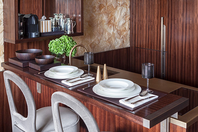 По желанию заказчика вместо полноразмерного кухонного гарнитура оборудовали небольшой уголок для готовки и компактную обеденную зону. Владелец квартиры, большой поклонник итальянской фабрики Promemoria: акцентами общей зоны стали барные стулья Bilou Bilou. Не смотря на скромные размеры, оборудовали весь необходимый набор техники, включая и винный холодильник.