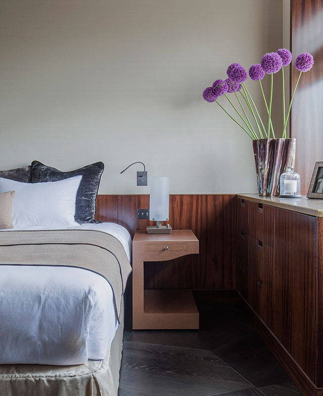 Поскольку квартира небольшая, использовать несколько брендов было неуместно. Отдельностоящие предметы — диван, кресла, кофейный столик и прикроватные тумбы с настольными светильниками также подобраны из разных коллекций Promemoria. Практически вся корпусная мебель выполнена по авторским эскизам итальянской столярной мастерской Simonetto.