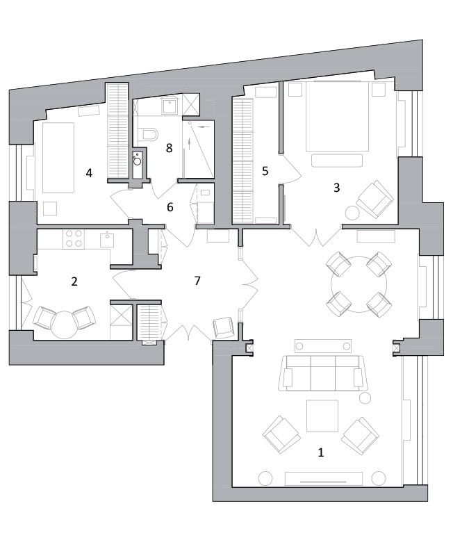 Особое место в проекте уделено светильникам. Акцентированные при помощи лепнины люстры Джонатана Адлера в гостиной, Арика Леви над обеденным столом, Акилле Кастильони на кухне и др. задают настроение каждой зоне и притягивают внимание. В прихожей на консоли можно заметить знаменитый настольный светильник Atollo, разработанный в 1977 году Вико Маджистертти и отмеченный спустя два года премией Compasso d’Oro — «Золотым циркулем».