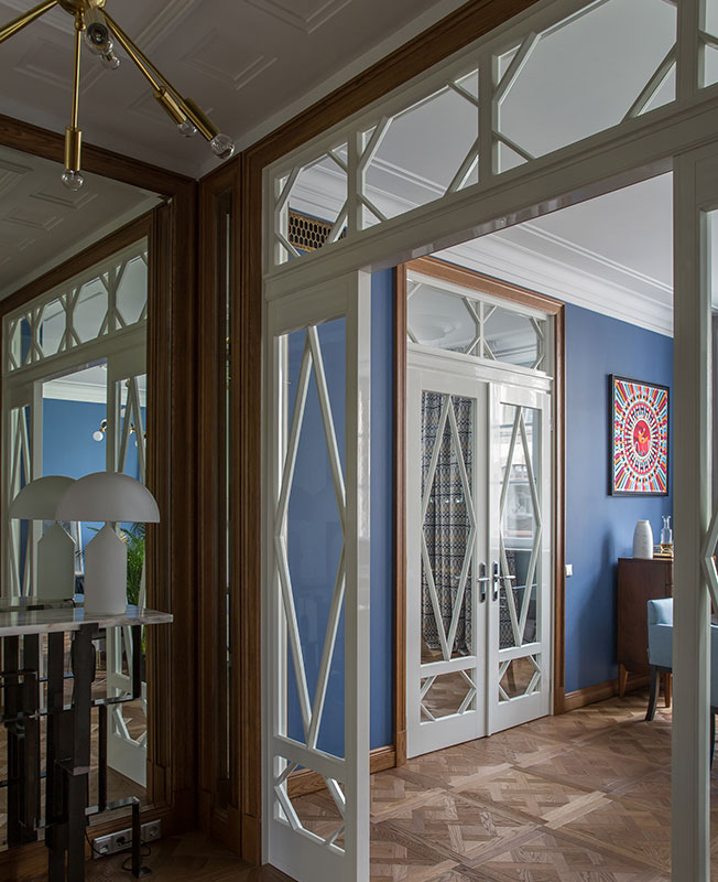 По эскизам архитекторов помимо лепнины также была изготовлена корпусная мебель и напольные зеркала в гостиной, форма которых также перекликается с узором створок авторских межкомнатных дверей.