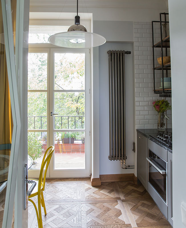 Павел и Татьяна хотели привнести в пространство исторические аллюзии. В первую очередь такими акцентами стали межкомнатные двери с расстекловкой, лепнина и дубовый паркет. Натуральная древесина плавно переходит в плинтус и затем наличники, создавая оригинальное обрамление на фоне выкрашенных стен.