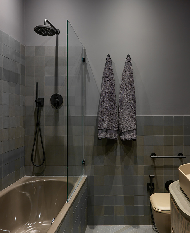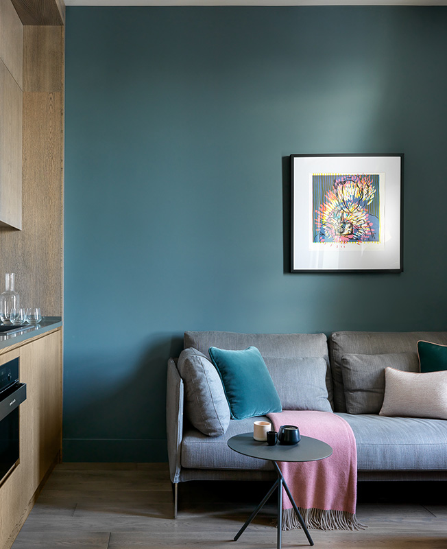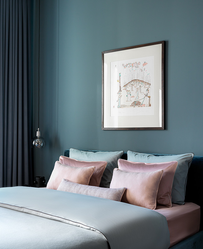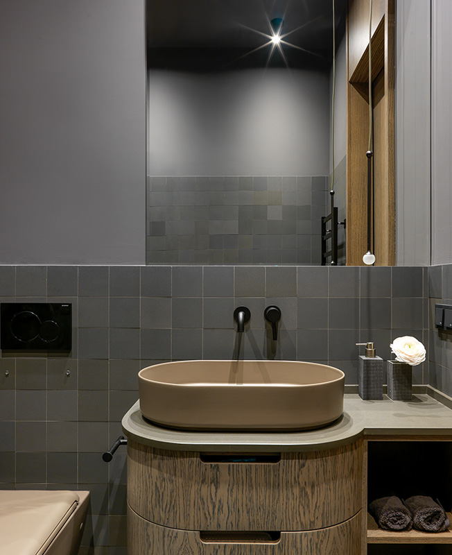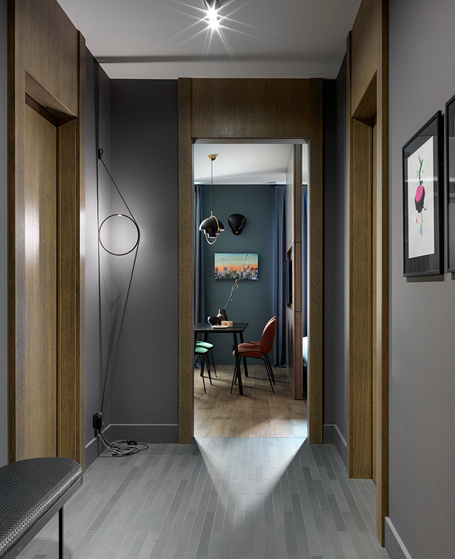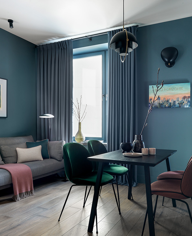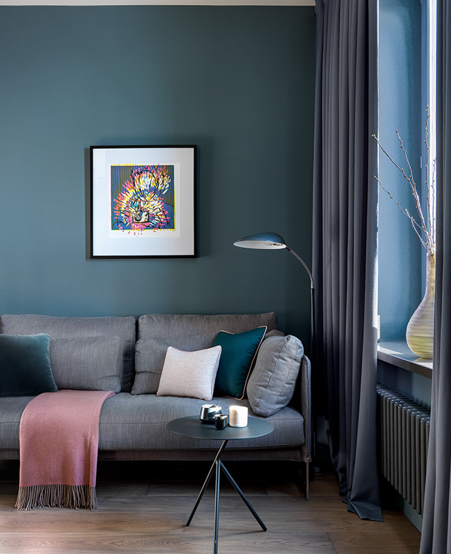 Дизайн предметов нейтрален. Если в чем-то и проявилось смелость, так это в цвете. Впечатляют глубокие краски на стенах. Входная зона, санузел и гардеробная объединены серо-фиолетовым оттенком. Гостиная со спальней — сложнейшим тоном, в котором есть и синева, и бирюза, и зелень. «В последнее время почти во всех своих проектах я применяю краски французского бренда Argile. Беспроигрышный вариант: никаких выкрасов делать не надо», — делится опытом Татьяна.