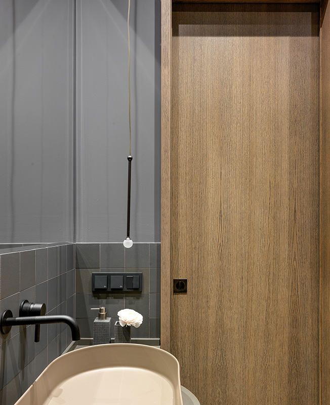 Функционально зоны разные, но дизайн един. Цвет, отделки, покрытие пола, членение столярных изделий — во всем выдержан цельный подход. «Дробность визуально сжимает помещение, оно кажется меньше, чем есть на самом деле. Когда концепция едина, нет ощущения малых метров, а есть воздух и свет».