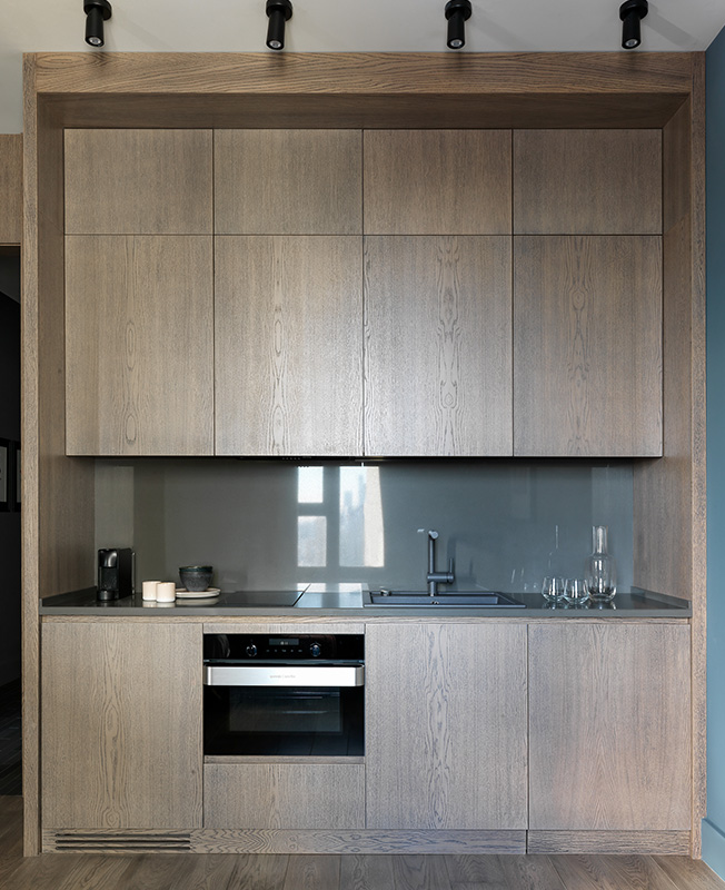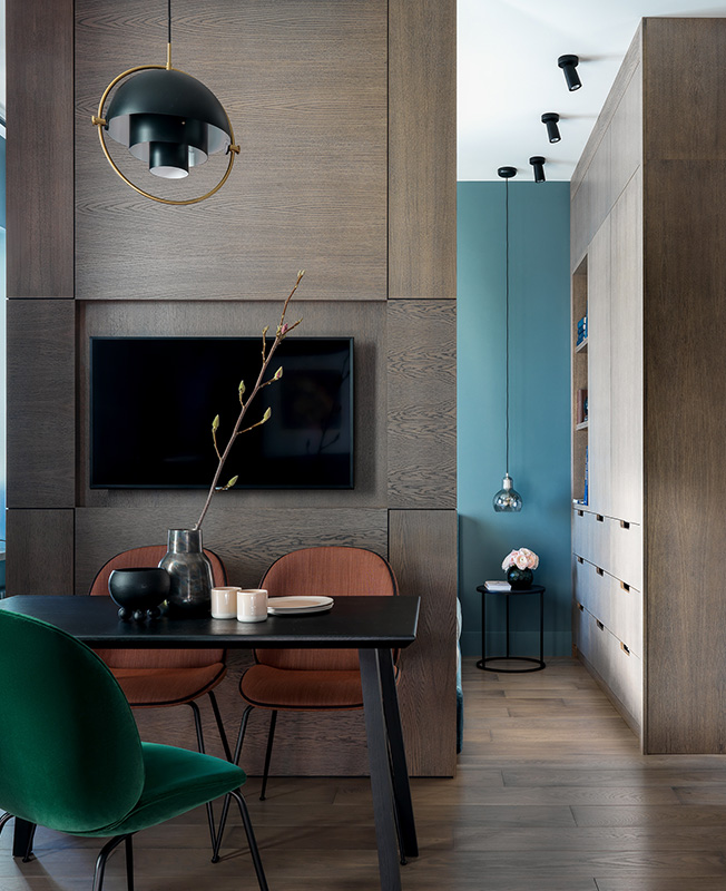 «Маленькие квартиры требуют особо тщательной проработки. Это не значит, что в больших проектах тщательность не важна. Но там есть свобода маневра, а здесь — мы зажаты метражом. Решения должны быть емкими, выверенными, правильными. Вот пример: расстояние между кроватью и перегородкой, отделяющей спальню от гостиной, составляет здесь всего 5 см! Мы не могли себе позволить даже 2-сантиметровый плинтус за изголовьем: пришлось сделать технологический вырез, чтобы поставить кровать вплотную к стене».