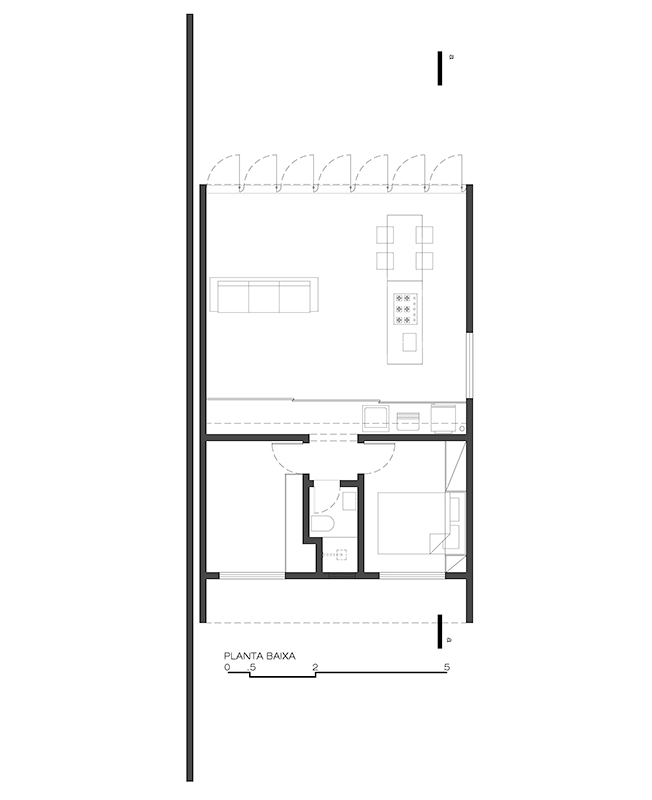 Изначально крошечная постройка площадью 24 кв. метра была расширена до 60 кв. метров. К уже имевшимся спальне и ванной комнате архитекторы добавили кухню и гостиную, чтобы у заказчика было все необходимое для комфортного проживания. Дом задуман как достаточно уединенное пространство, поэтому вместо дивана стоит только одно кресло для чтения.