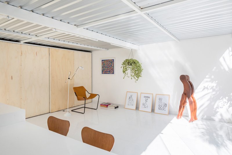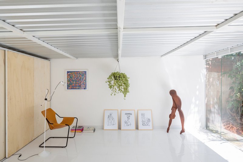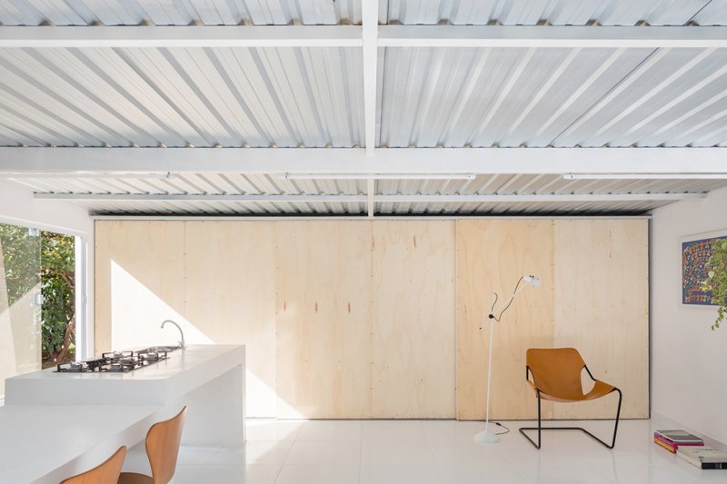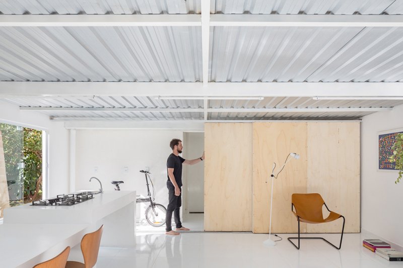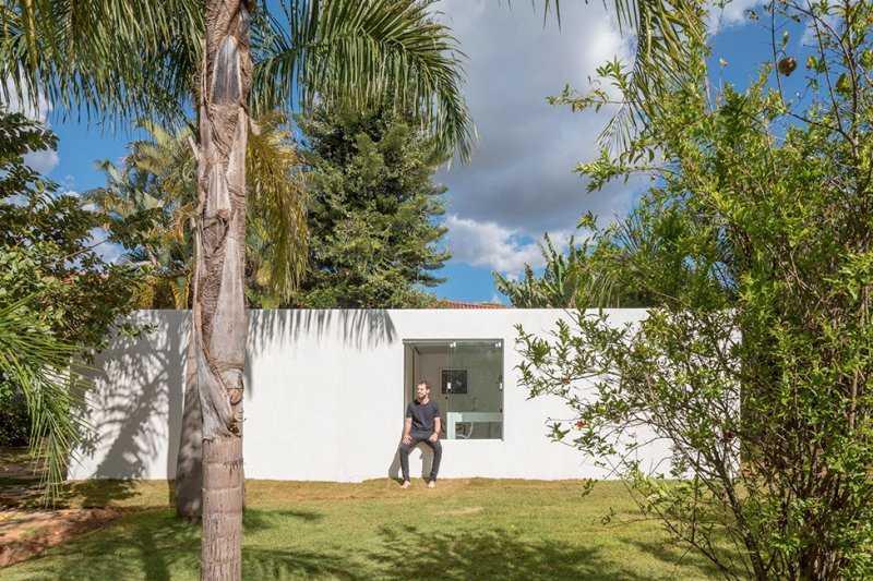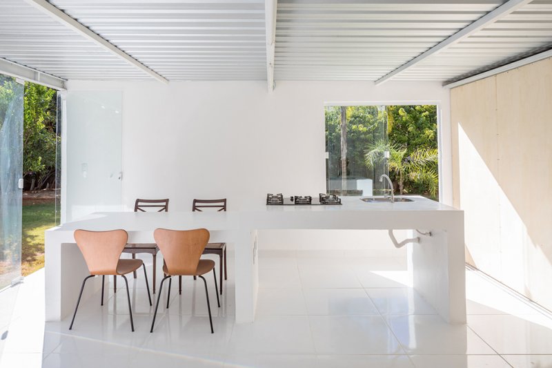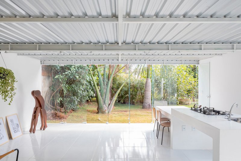 Белоснежная отделка внутри и снаружи помогает отражать солнечные лучи и защищает от сильной жары в Бразилии. Основное жилое пространство находится на одном уровне с садом, а стеклянные двери в полный рост распахиваются, обеспечивая вентиляцию и естественное освещение.