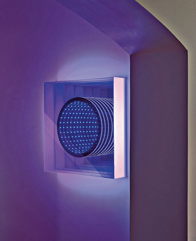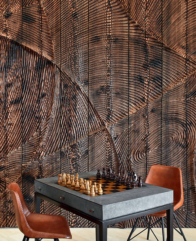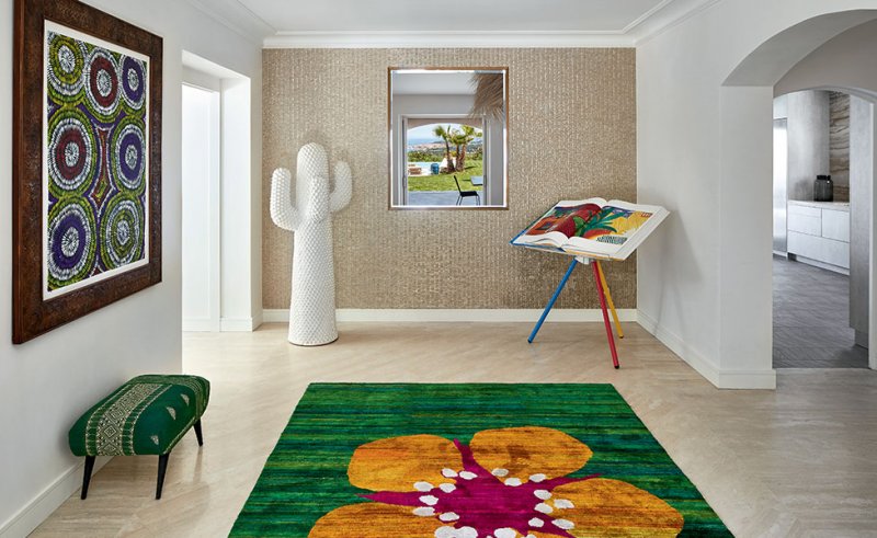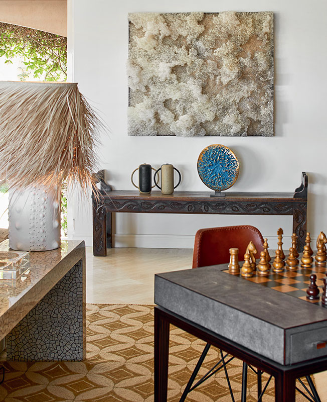 Волокно рафии, плетеный раттан, индийский растительный шелк, резное дерево, брашированный мрамор, шагреневая кожа и эбен создают яркое живописное полотно. Этника — работы искусных ремесленников, Стефани сотрудничала с мастерской Rock the Kasbah, которую Филипп Ксерри основал в Тунисе. Молодой амбициозный дизайнер подходит к аутентичному ремеслу с современными мерками, соединяет восточный колорит с европейскими 1950-ми, в духе устойчивого развития использует локальное сырье. Дизайнерская вешалка-кактус, культовая модель от Gufram, точно попадаетв тему и вносит нужную ноту иронии.