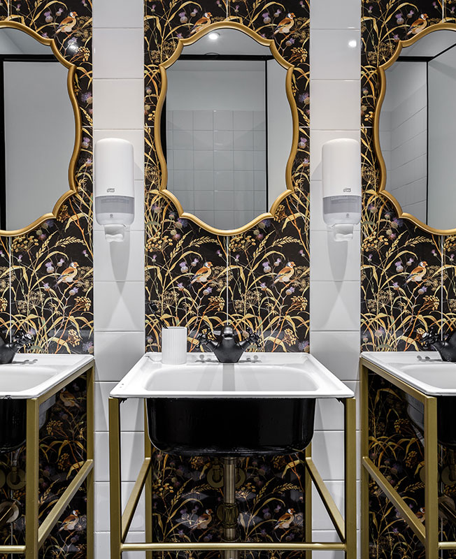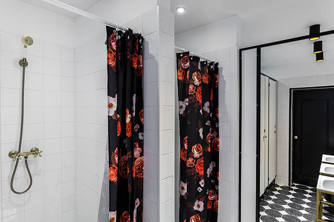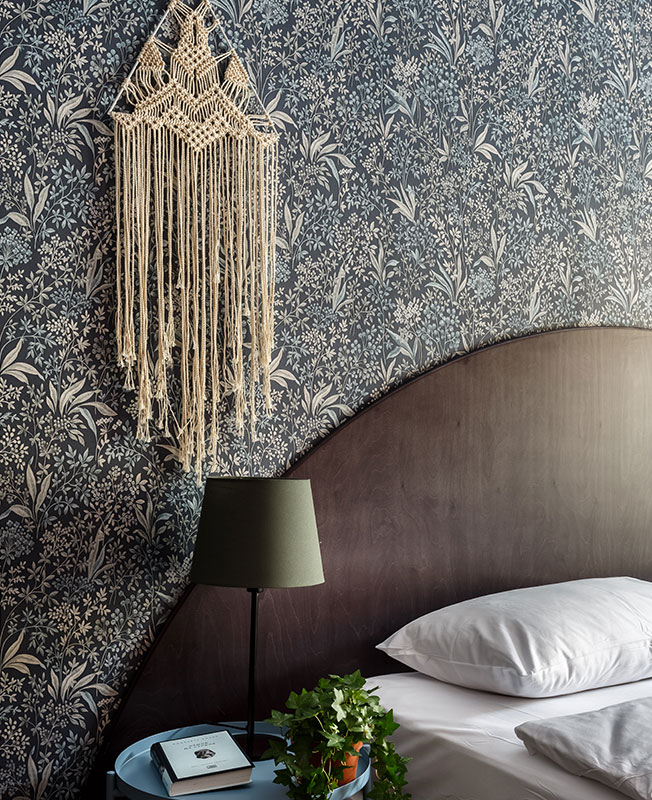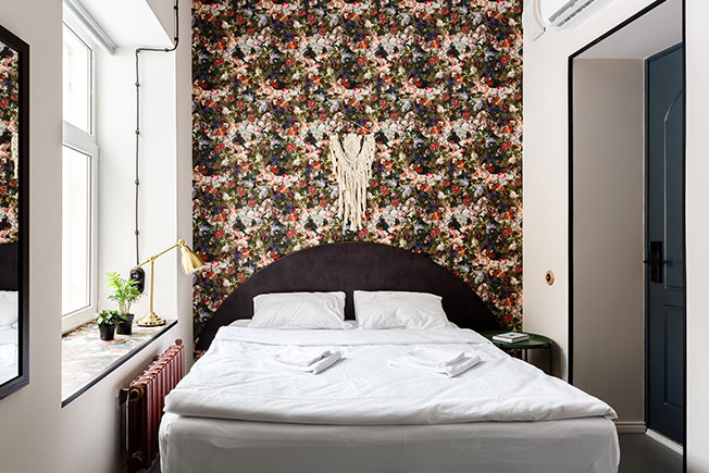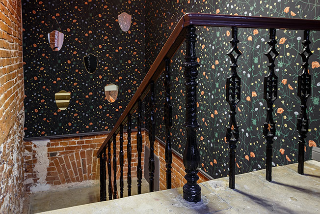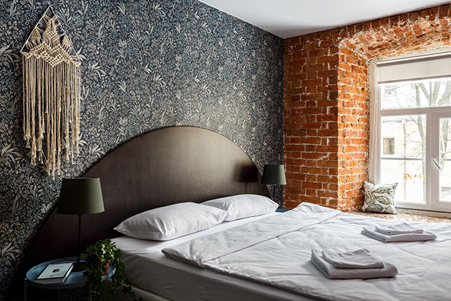 Эклектичное пространство хостела объединяет открытую кирпичную кладку и крупные цветочные принты (аллюзия на праздничную исконно русскую одежду), яркие стены и фактурный текстиль, наружную электропроводку и латунные элементы. И складывается впечатление, будто ничто иное лучше не подошло бы месту с названием «Клубничная утка».