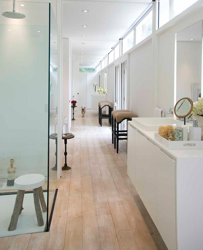 Одна спальня — с видом на сад, другая с видом на бассейн. Две зеркальные ванные комнаты расположены между главной спальней и спальнями для гостей и служат буфером.