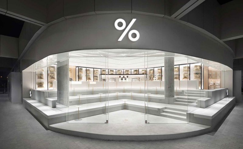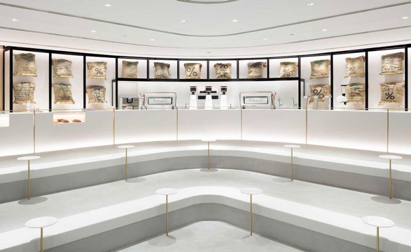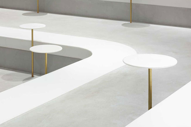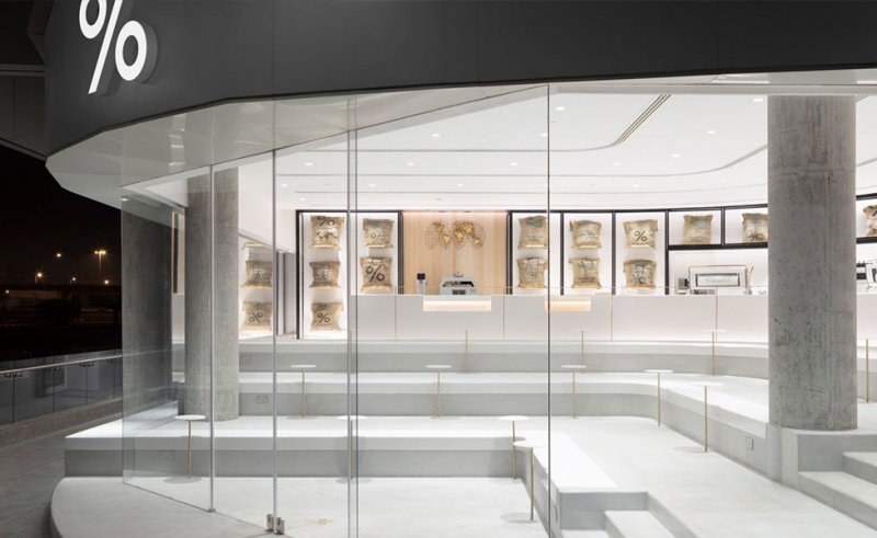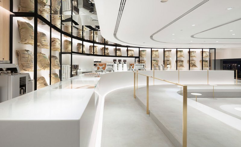 Кафе-бар площадью 190 кв. метров занимает угловое здание с изогнутым стеклянным фасадом. Внутри светлый интерьер со ступенчатыми бетонными сидениями и латунными светильниками. Ступени ведут к дальней стене пространства, где расположена полукруглая барная стойка и стенд с разными сортами кофе — в льняных мешках кофе высшего сорта из Хигасиямы, Япония.