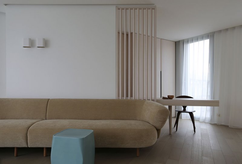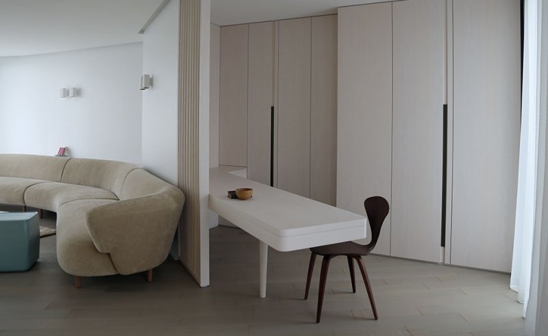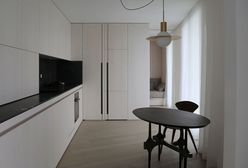 Заказчики просили минимум предметов — их просьбу мы с удовольствием выполнили. Мебель в основном встроенная, в отделке из беленого ясеня. На полу дуб, в кухне — бразильский гранит. Стены словно обтянуты вуалью. Всё подчинено идее теплого белого света. Для меня такое текучее, транспарентное, светлое пространство, наполненное свободно циркулирующим воздухом, является образцом современной роскоши.