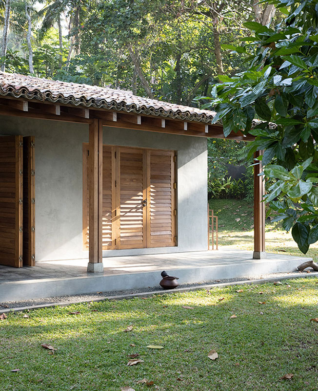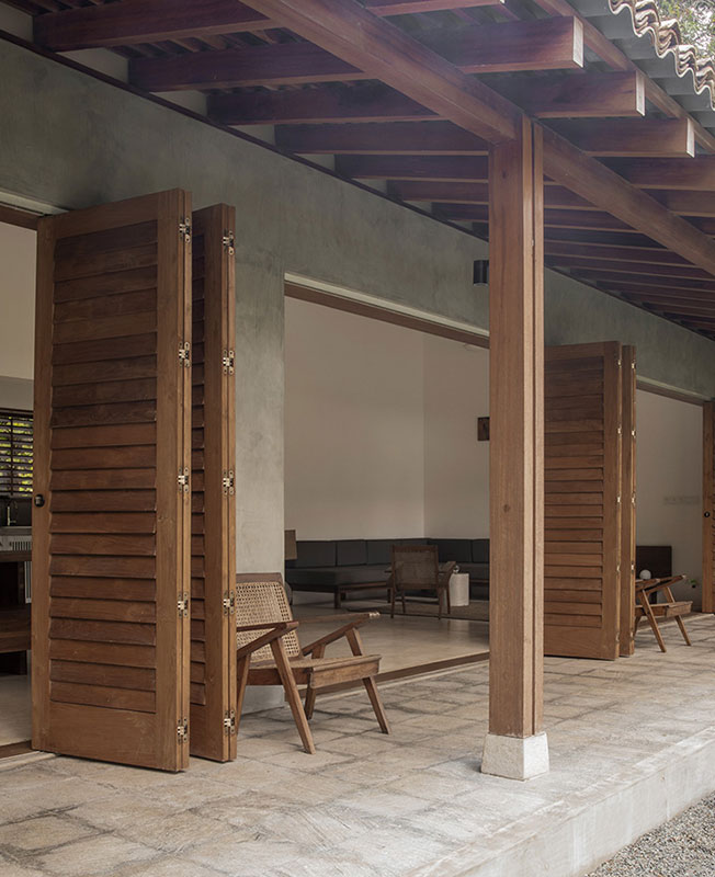 Высокие ставни расположены вдоль всего периметра здания — сквозь них можно пройти на открытую веранду. Ставни сделаны из дерева, чтобы избежать застекленных проемов. Щедрые крыши закрывают внутренние и наружные пространства от дождя и солнца, что позволяет создать особое ощущение защищенности и комфорта на природе.