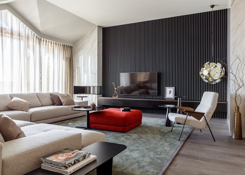 Просторную гостиную дизайнеры оживили стеной из ритмичных черных реек. Кресло — классика дизайна от Walter Knoll: модель Votteler, которую Арно Воттелер спроектировал в 1956 году, успешно выпускается по сей день (мастерской интерьера Wonderful). Подвесной светильник Zuiver. На консоли коллаж Андрея Серкова