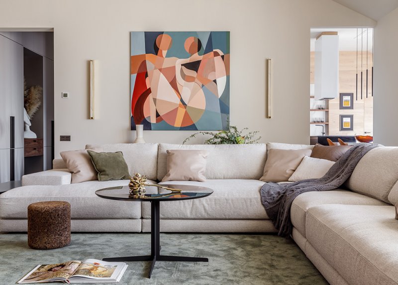 Гостиная. Крупная яркая работа, собственность заказчика, определила палитру помещения. Диван и пуф изготовлены на заказ. Пробковый столик-пуф Moooi. nonehttps://www.instagram.com/introsideme/https://www.facebook.com/rita.listopadova.7none
