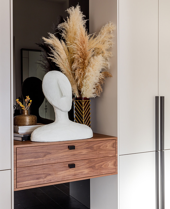Планировка от застройщика не отвечала ни эстетическим и архитектурным требованиям. Мы хотели четко разграничить общественную и приватную зоны, минимизировать количество дверей, увеличить высоту проемов, добавить логику движения по квартире. В результате перепланировки получили просторную гостиную правильной формы с двумя открытыми проемами в кухню и прихожую, которые, в свою очередь, тоже просматриваются за счет проходного коридора и отсутствия дверей. Благодаря круговому движению есть ощущение единого пространства.