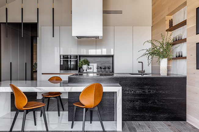 Кухня изготовлена на заказ. Стол отделан крупноформатным керамогранитом. Стулья Calligaris. На острове ваза Ananas Ceramic Studio.