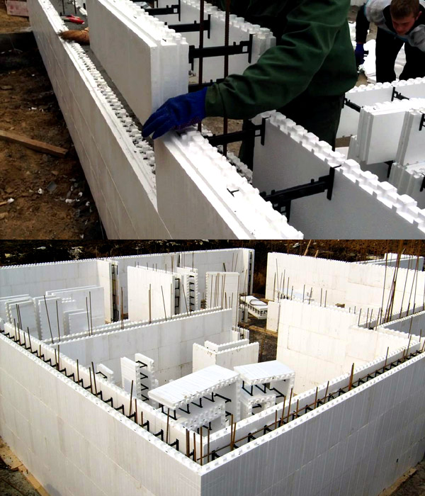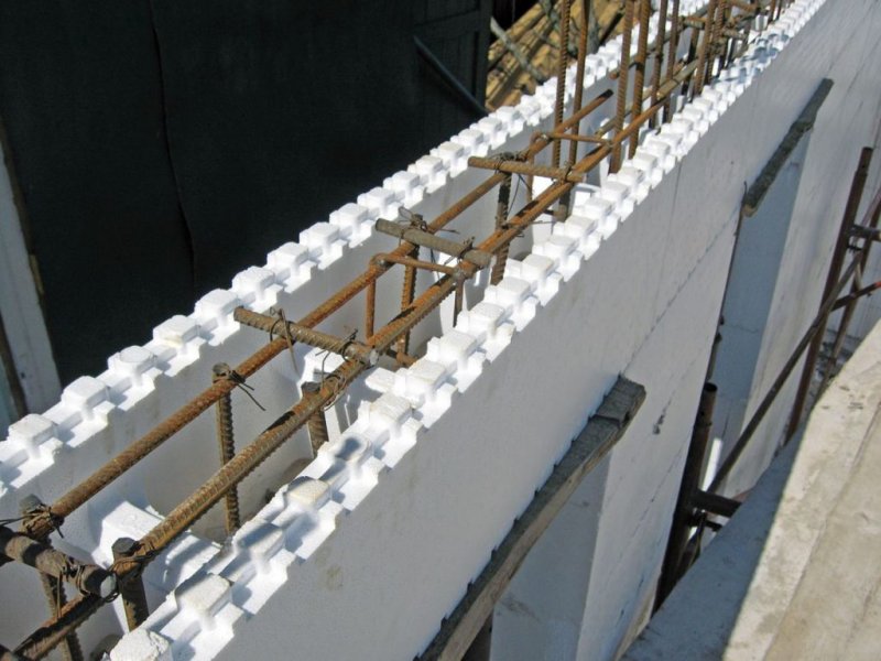 Между стенками арматуры размещается арматура, и, если это однослойная стена, это также полоса термоизоляционного материала. Сверху желоб, образованный фитингами, заполнен бетонной смесью. К сожалению, пока бетон не достигает полной прочности (и длится до нескольких недель), стены не могут быть продолжены. В то время как сборные балки имеют ограниченную длину (до 3 м), U-образные перемычки со значительно большими пролетами.