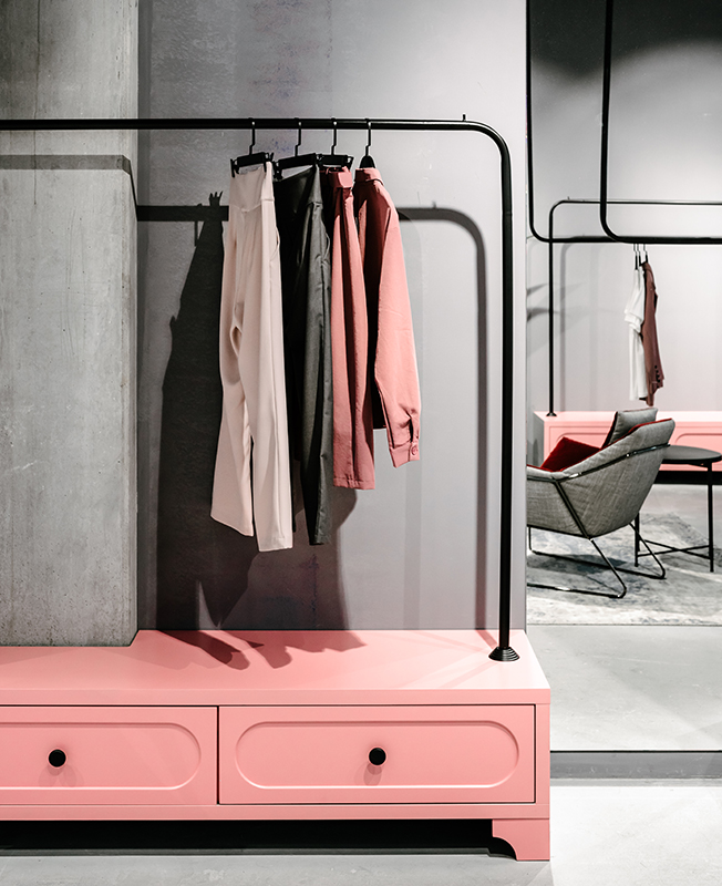 При работе над пространством площадью 70 кв. метров стояла задача уйти от привычного образа женского магазина. «Серый, но теплый минималистичный интерьер стал нашим выбором», — говорит архитектор. Фоном стал бетон: оставшийся от строителей пол и потолок, а также часть стен. Остальные стены отделали декоративной штукатуркой темно-синего цвета. Вместе с розовым и серым он сформировал палитру интерьера.