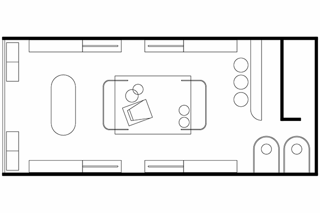 Подвесные вешалки не только демонстрируют одежду, но и разграничивают помещение, выделяя витринную зону, зону ожидания и кассовую зону. Лаконичный вид и «парящая» конструкция не перегружают пространство визуально. Корпусная мебель, подвесные вешалки и стол были изготовлены на заказ украинской компанией Meblirini. Комфорта добавляет мягкая мебель европейских брендов: кресла New York от Saba Italia, пуфы Vega от EnoStudio, барные стулья Angui от Аytm.
