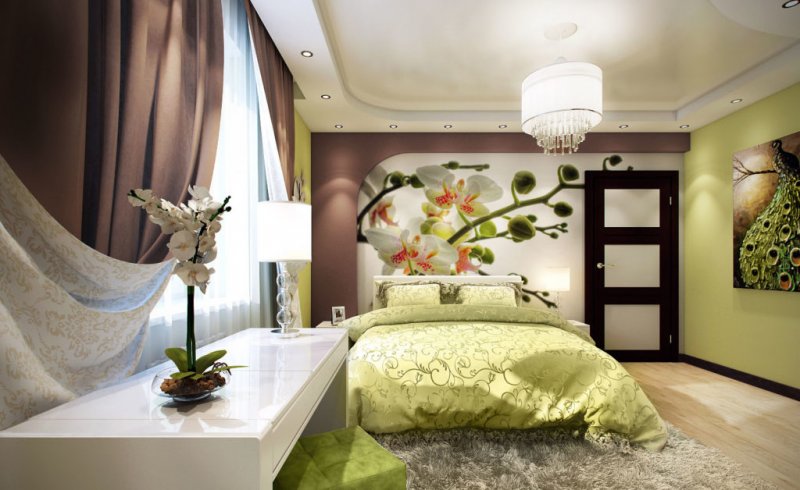 Такие цвета стен в спальне также являются хорошим фоном для более выразительных дополнений, например, в цвете коричневого и потухшей зелени. На полу в спальне чувствуется коврик.