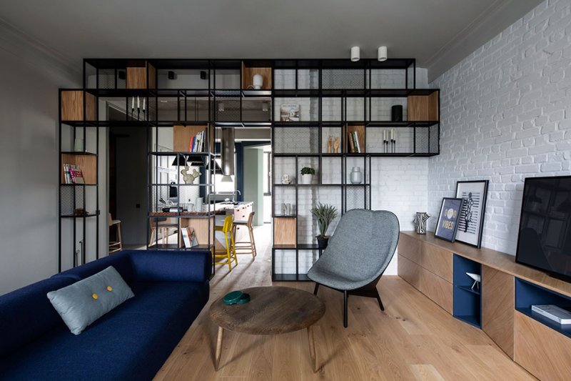 Часть пространства сделали открытым — сформировали просторную гостиную с диванной группой и кухню, отделенную от общей зоны лаконичным металлическим стеллажом, с большим островом, барной стойкой и компактной столовой. Часть помещений остались изолированными — спальня, санузел с ванной и душевой. В прихожей оборудовали компактную постирочную и гардеробную. В получившемся объеме создали современный лаконичный интерьер с элементами лофта.