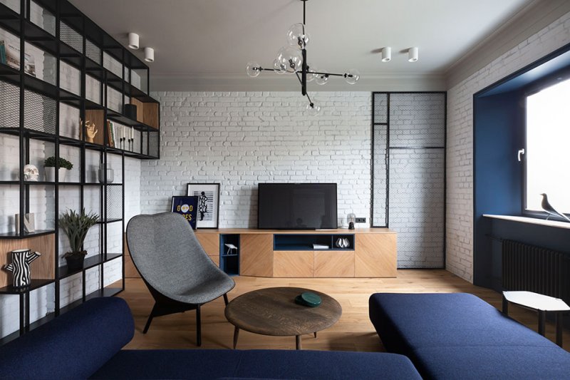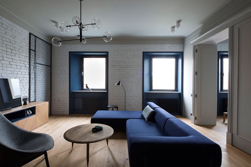 В отделке использовали натуральные экологичные материалы и природные оттенки. Основой палитры стал белый и серый цвет, дополненные контрастными вставками глубоких синих тонов. Колористическое решение разворачивается на фоне теплого оттенка пола из натурального дуба с необычной геометрией.