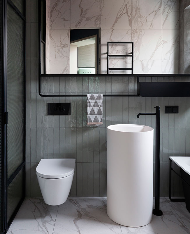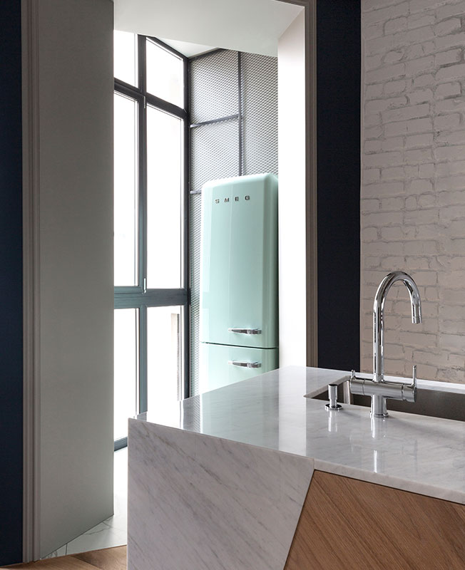 «Во время обсуждения планировки мы предложили в шутку поставить холодильник на балкон из-за небольшой площади квартиры. Заказчику идея понравилась, и теперь позитивный холодильник Smeg выглядывает с балкона, радуя всех своим цветом».