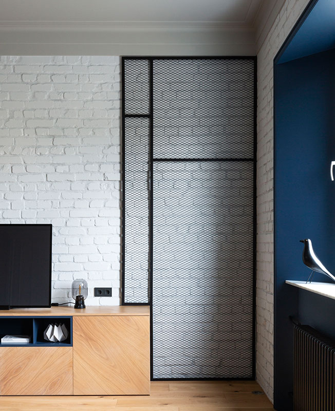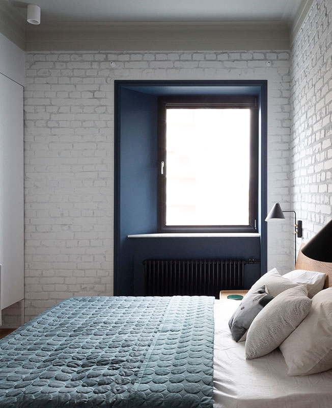 Так как окна изначально были небольшие, мы постарались максимально их раскрыть, чтобы добавить естественного света. Убрали лишние переплеты, выбрали узкий профиль рам и развернули откосы. Выкрасили их в глубокий синий цвет — акцентировали и сделали одной из главных тем квартиры».