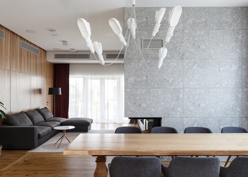 В гостиной представлена мебель лучших итальянских брендов. Диван от Flexform, столик Poliform и тумба под ТВ Molteni&C — образцы элегантной роскоши. Люстра Karman Italia над обеденным столом вносит динамику в спокойный интерьер.