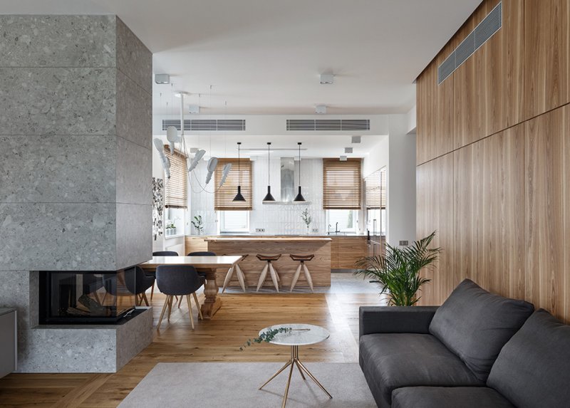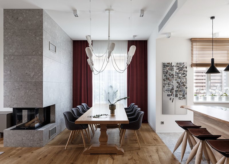 Просторная гостиная объединена со столовой и кухней. В рабочий кабинет ведет «потайная» дверь у окна: полотно отделано тем же шпоном, что и стена, поэтому почти незаметно. В центре опен спейса — камин. Он ориентирован на три стороны, так что живым огнем можно любоваться из любой точки.