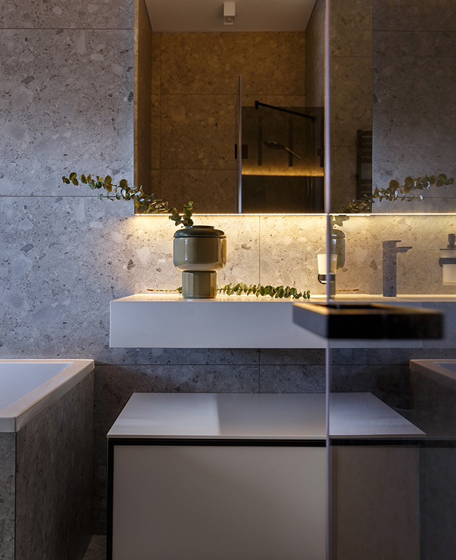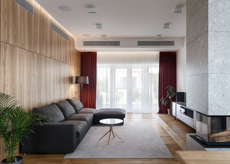 Отделка дома выполнена из природных материалов или таких, что достоверно их воспроизводят. Тон задают шпон ясеня и керамогранит «под камень» марки Cerim — теплые и холодные фактуры проявляют красоту друг друга, их соотношение оптимально. Мягкая натуральная палитра разбавлена глубокими оттенками текстиля.