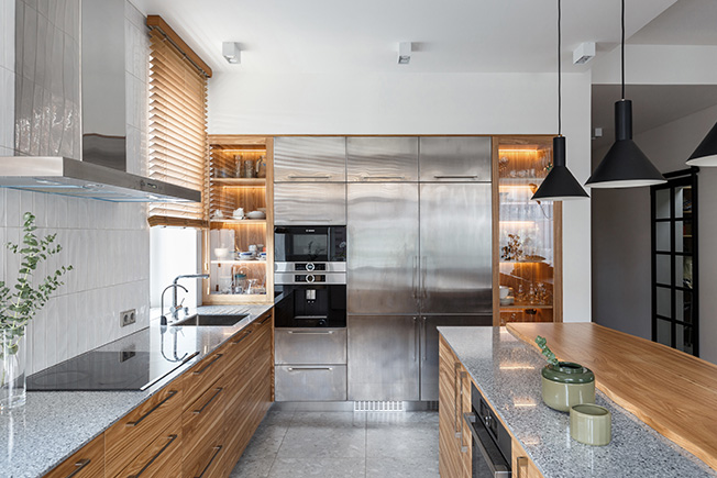 Конфигурация дома позволила логично разделить общественную и приватную зоны. При входе расположили техническое помещение с подвалом для инженерного оборудования (очистка воды, система отопления и канального кондиционирования и вентиляции). Здесь же разместили компактный гостевой санузел. Рядом с кухней устроена вместительная кладовая для продуктов.