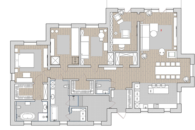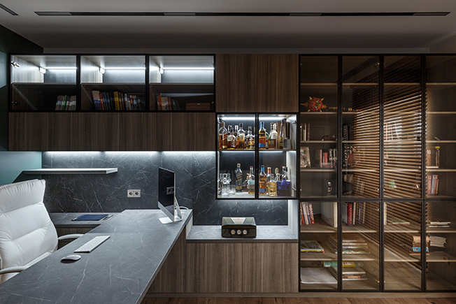 Как и во всех проектах SVOYA studio, здесь много предметов индивидуального изготовления. Кухня, обеденный стол, прикроватные тумбы, рабочий стол в кабинете, оригинальные барные табуреты — всё выполнено специально для проекта. «Следуя принципу «от общего к частному», мы уделяем внимание деталям, активно развивая направление предметного дизайна», — говорят авторы.