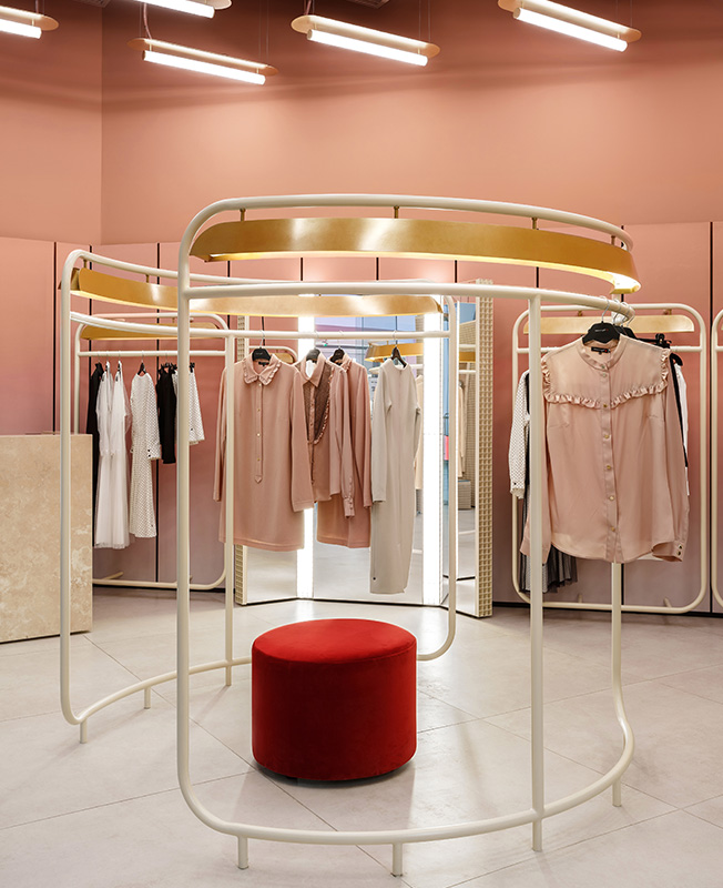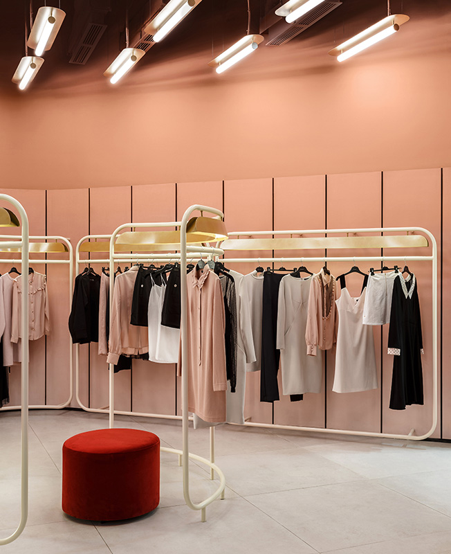 Пудрово-розовый и желтый, точеные изгибы светильников, бархатные пуфы отсылают к женственному началу. Им противостоят металлическая сетка витрин и конструкции рейлов, похожие на строительные леса, которые ассоциируются с мегаполисом. Жесткий ритм светильников на потолке олицетворяет скорость и решительность.