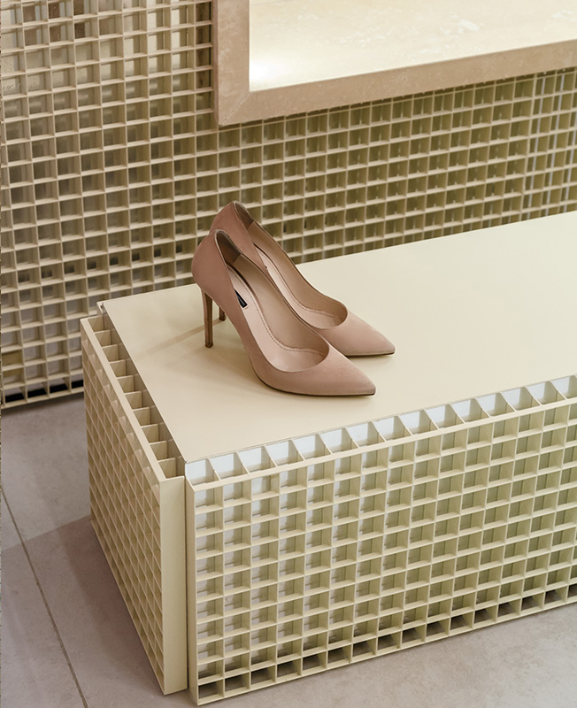 Детали бутика выполнены в травертине. Этот благородный натуральный камень стал отражением элегантности, изысканности. Его дополняют латунь, покрытый лаком металл, чувственный бархат.