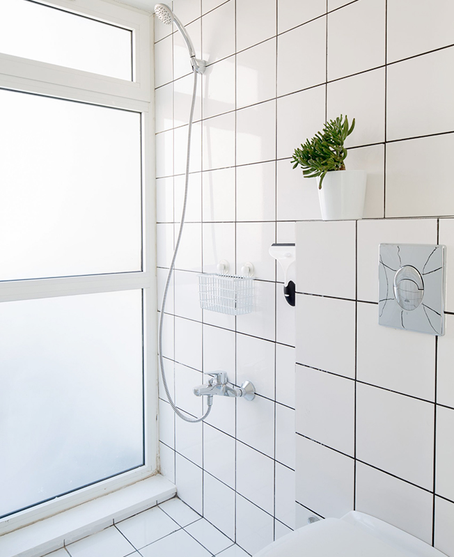 «Бейрут сегодня — место, где трудно найти качественное жилье по доступной цене, — говорит основатель студии, архитектор и дизайнер Эли Метни. — Уменьшение размеров теперь в тренде». Чтобы увеличить количество отраженного света от больших окон по обеим сторонам комнаты, стены выкрасили в белый цвет, а пол залили белоснежной эпоксидной смолой. Того же цвета и плитка в зоне кухни и санузла. Затирка для швов контрастного черного цвета формирует геометрический узор.