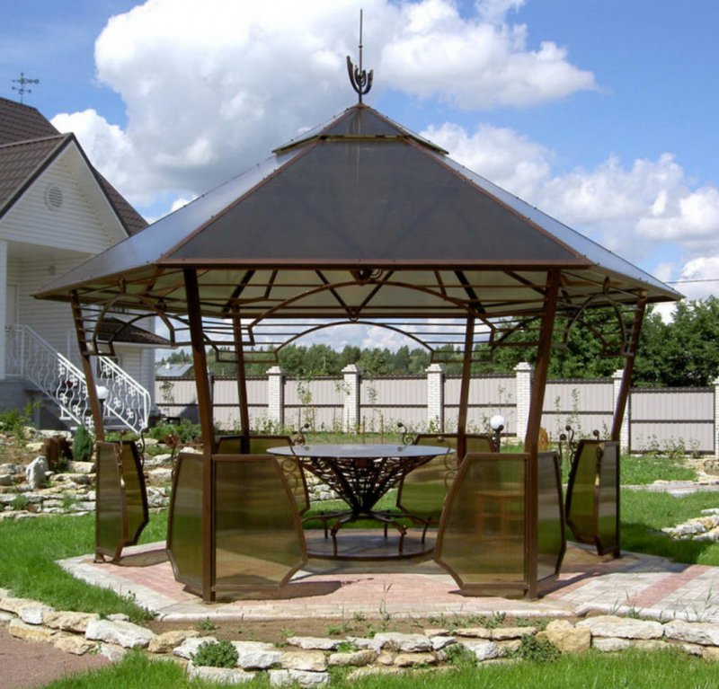 Беседка станет украшением любого участка. В ней можно расположить лавочки, обеденный стол или мангал (печь для барбекю). Металл, используемый при возведении беседки или зоны для отдыха, позволит воплотить любую фантазию дизайнера, а так же может послужить каркасом для украшения вьющимися растениями или тканью.