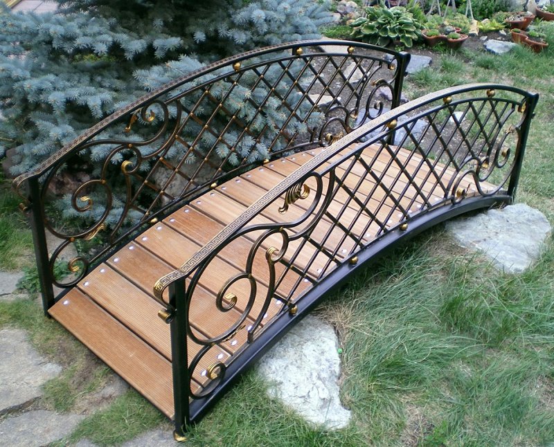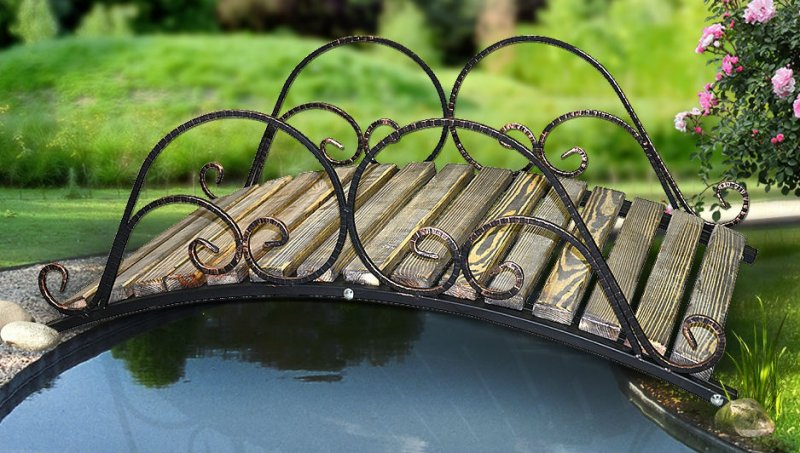Если на участке есть водоём – стоит выбрать мост из металла с коваными перилами. Помимо долговечности и устойчивости к влаге он будет гармонично смотреться на фоне зелени и воды. Часто декоративный мостик ставят для украшения участка, например, рядом с фонтаном, чтобы придать оформлению законченный вид.